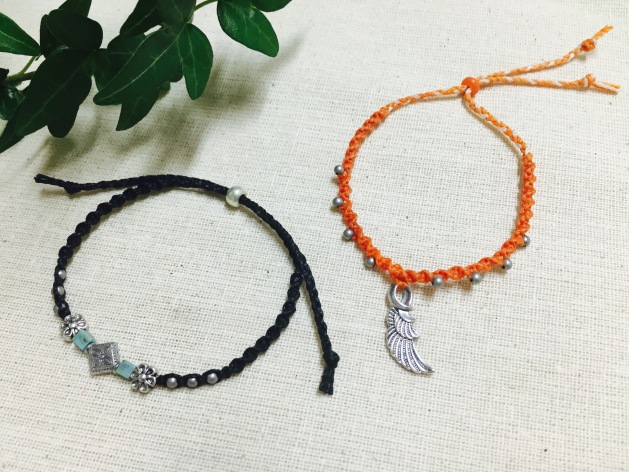 ワックスコードに、ビーズやチャームを編み込んでブレスレットやネックレスを作ります。大きめのビーズを中央に配置するタイプと、チャームと小さなビーズを編みこむタイプ2種類から選べます。もちろん両方つくることもできるので、楽しみながら「マクラメアクセサリー」を作ってみよう。