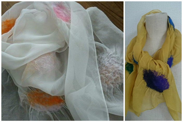 本体のシルク生地に羊毛をのせて、摩擦で異素材を絡め合って出来るショール。1時間ほどで仕上がります。本体の布は三浦先生の手染めです。色の組み合わせ次第で素敵なショールが作れます。