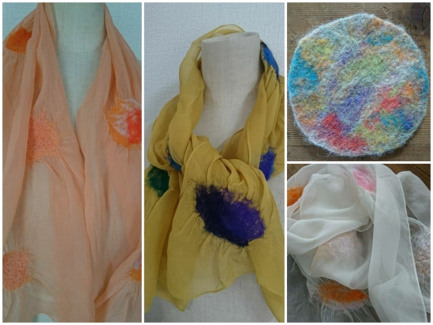 本体のシルク生地に羊毛をのせて、摩擦で異素材を絡め合って出来るショール。1時間ほどで仕上がります。本体の布は三浦先生の手染めです。色の組み合わせ次第で素敵なショールが作れます。