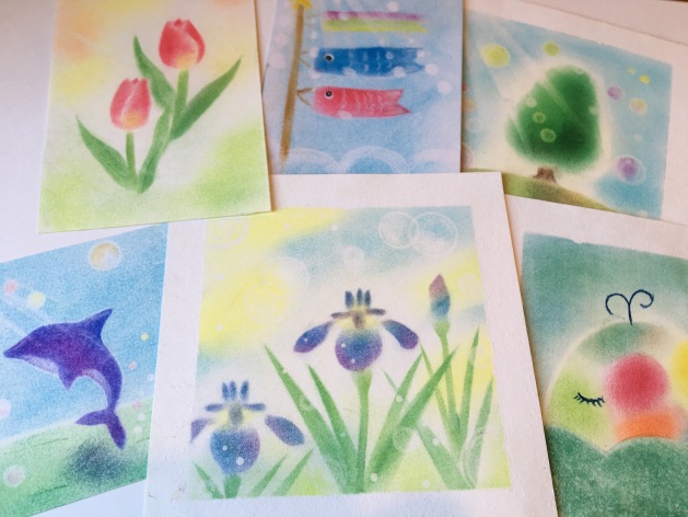 色とりどりのパステルを、パウダー状にして指でクルクルと型紙に合わせて描いていきます。何度でも、消しゴムで修正しながら描き直せる。