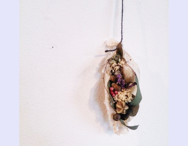 ロウビキ加工を施した布に数種類のドライフラワーをアレンジしていきます。ミノムシみたいな形に形成していき、ぶら下げるタイプです。ご自分や大切な方へのプレゼントにご参加してみませんか。