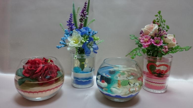透明な器の中に、色とりどりの砂で模様を描いていきます。かわいいガラス細工や、お花(造花)のアレンジでトッピング。最後に透明ジェルを流し入れて固まったら出来上がり!サラサラの砂で模様を作っていく、清涼感たっぷりのオブジェの完成です。