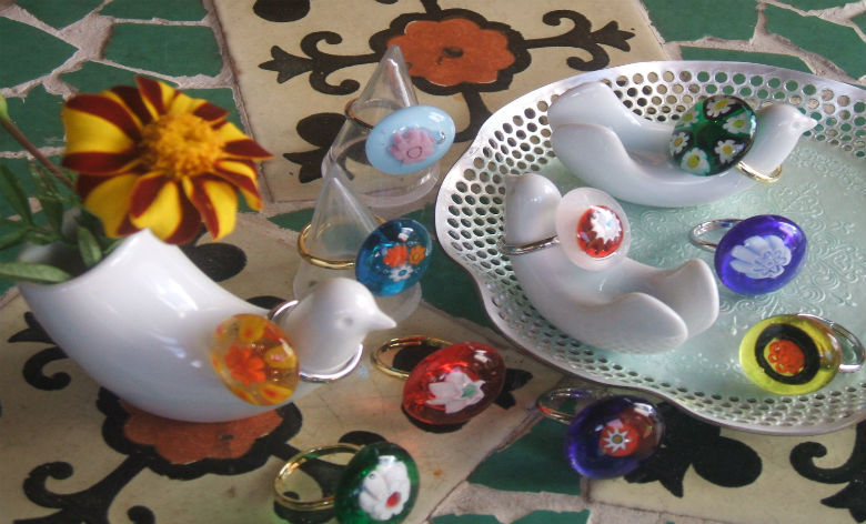 イタリアのヴェネチアンガラス「ミルフィオリ」(千の花という意味)を使って指輪を作ります。