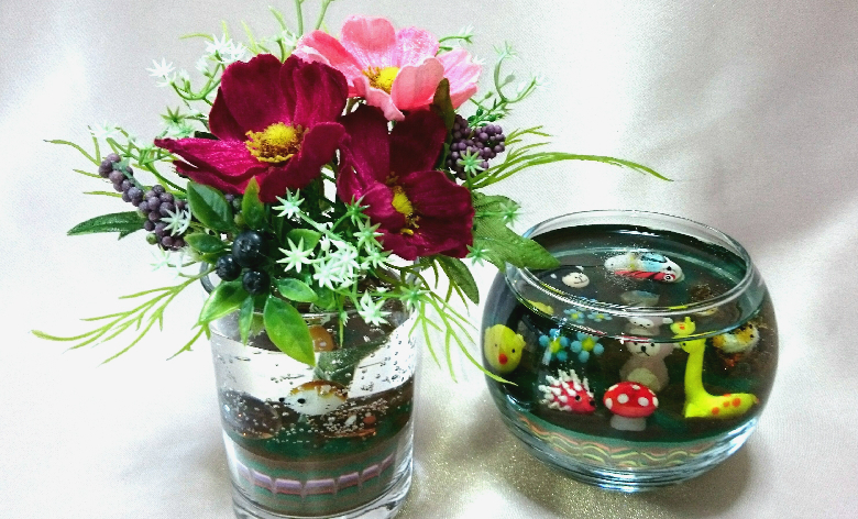 最後に透明ジェルを流し入れ、固まると落ち着いた雰囲気のオブジェが完成します。