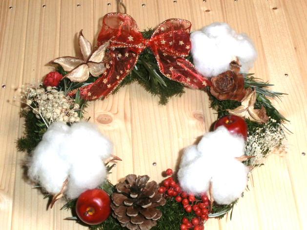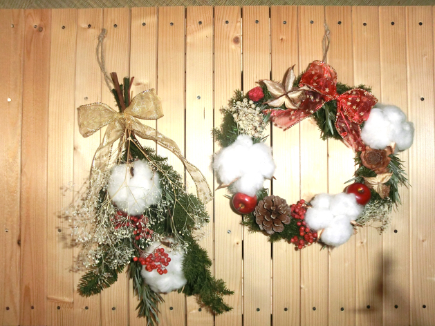 コットンボールとドライグリーンなどを使ったクリスマスリースや、枝付きのコットンボールとドライフラワーなどを使ったスワッグを作りましょう!