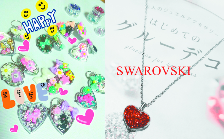 スワロフスキーやパールを樹脂粘土に埋め込みオリジナルのアクセサリーを作りましょう♪お子様向けに「ビーズアクセサリー」をデコレーションできるデコ時計やキーホルダーもご用意しています!