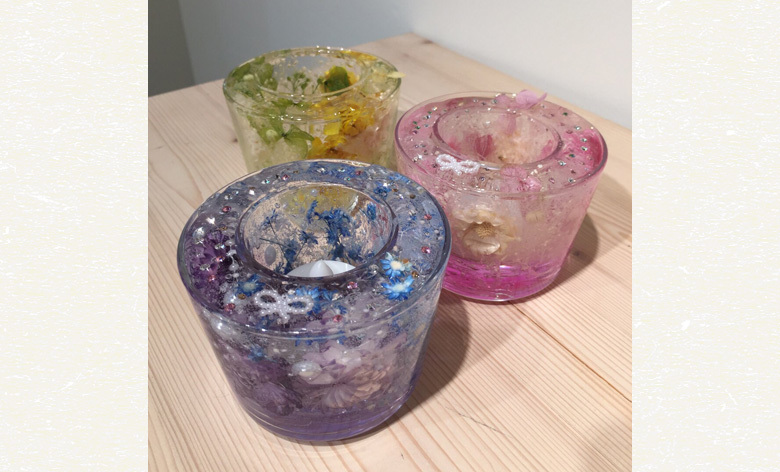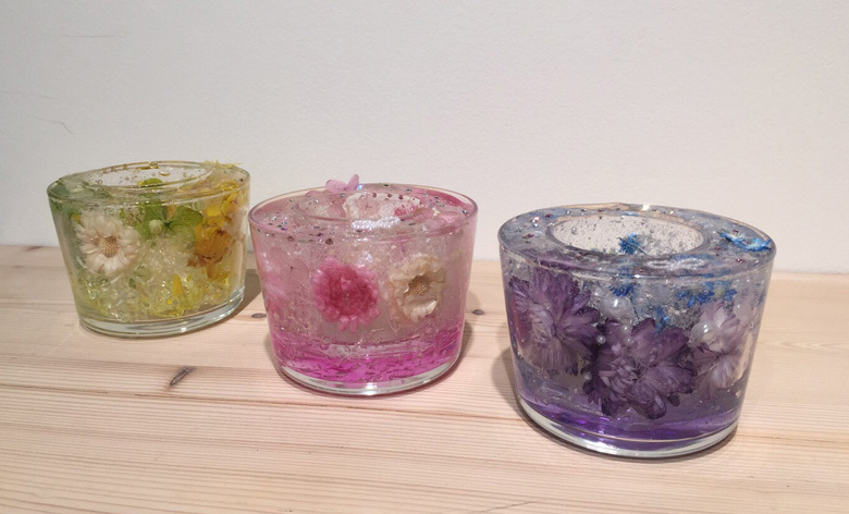ドライフラワーを二重の透明容器の外枠にアレンジし、透明ジェルの「ロウ」を流し固めます。ジェルの表面が固まりかける時に、スワロフスキー・クリスタルを飾り付けるとより美しく仕上がります。