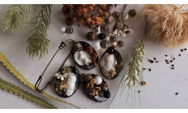 ガラスと植物をコラージュするように作るアクセサリーのワークショップです。ガラスの粒やオーナメント、ドライフラワーを組み合わせてピンブローチに仕上げます。ノスタルジックな気分になれる楽しい時間を是非。