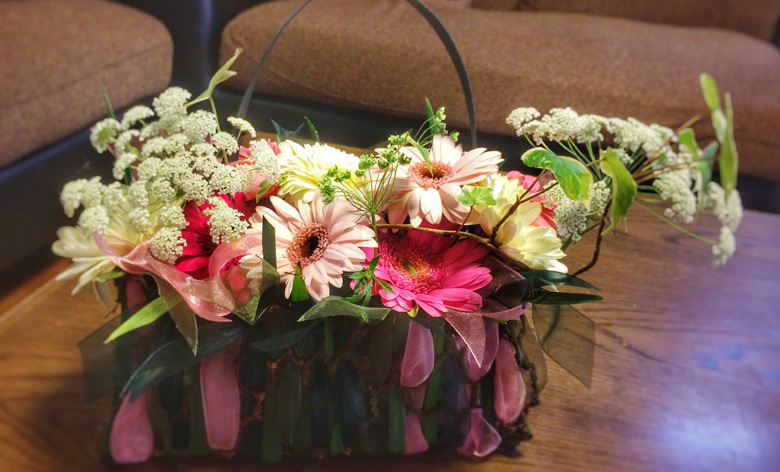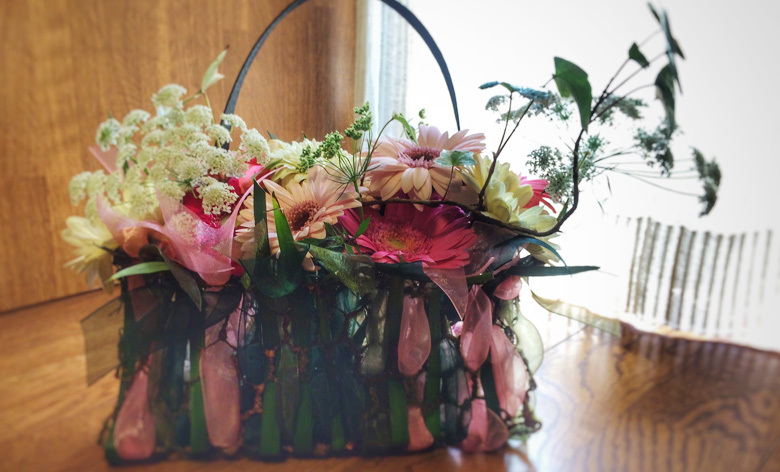 そのバッグにガーベラやレースフラワーをアレンジして、バッグブーケに仕上げます。