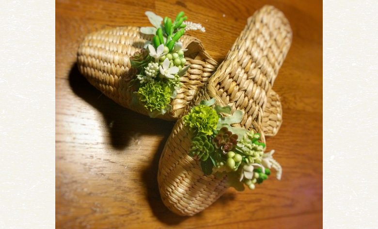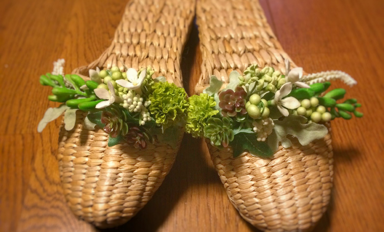 履きごこち満点で人気の天然素材のスリッパをベースにアーティフィシャルフラワーをあしらって、涼やかなスリッパを作りましょう。