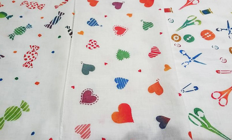 染織工房someoriko-bo-のオリジナル型紙(300種類以上)を使い、自由に配置、好きな色で模様を絵付けしていき、オリジナル作品を作りましょう。