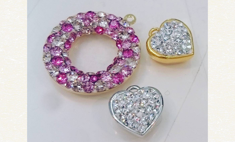スワロフスキーで作る"グルーデコ"、キラキラ輝くオリジナルのアクセサリーを作りましょう♪ 二種類の粘土質のグルーをアクセサリーの土台へ設置し、スワロフスキーを埋め込んで作ります。