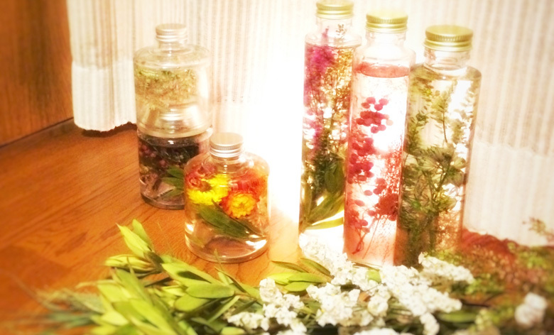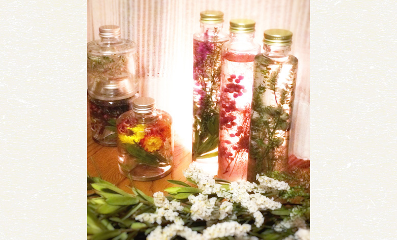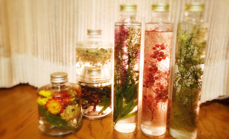 暑い季節はもちろん、新しい花の楽しみかたちとしてオススメです。数本並べたり、スタッキングしたり…、飾り方はいろいろ。花材、ボトルを選んでお気に入りを作りましょう。