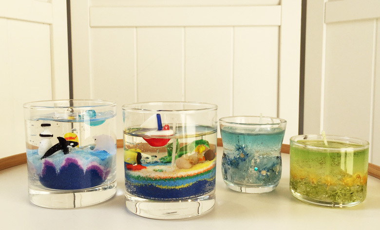 貝殻やお花、海の生き物(ガラス細工)などの材料からお好みを選び、オリジナルジェルキャンドルを作りましょう。夏休みの工作にもおすすめ。