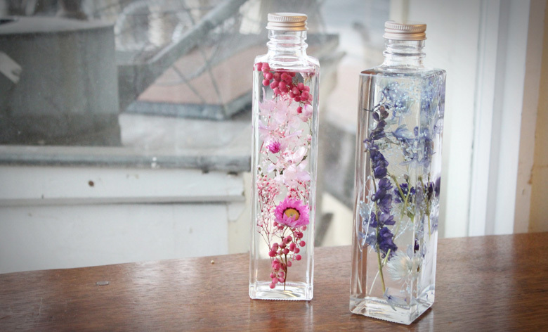 お好きな形のビンに花を封じ込めていきます。見ているだけで心が落ち着くインテリア。