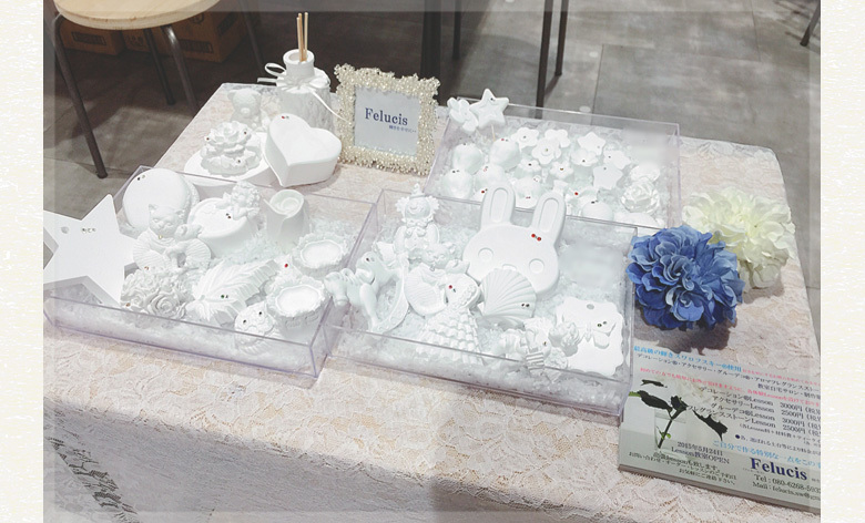 天然のアロマオイルを混ぜ込んだ石膏で、香りのインテリアを作りましょう。いろいろなシリコン型の中からお好きなものを選び、アロマの香りを混ぜ込んだ石膏を流し固めます。できあがったものに、スワロフスキー(R)ストーンでポイントデコレーションができます。