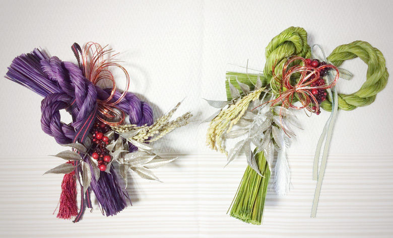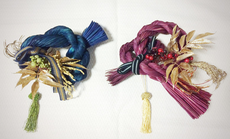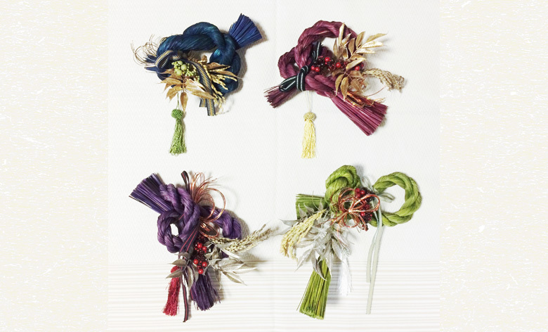 カラーしめ縄をベースに、デザイン、材料を選んで、お気に入りのお飾りを作りましょう。毎年好評いただいておりますお飾りづくり。今年は、真田紐(サカモトオリモノ)を使って粋な仕上がりに!