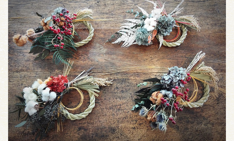 お正月を迎えるために飾るしめ縄。お正月が終わっても、お花やグリーン部分だけをスワッグとして飾っていただける、そんなしめ縄を作りましょう。いろいろな花材の中から自由に選ん作ったしめ縄で、楽しくお正月を迎えましょう。