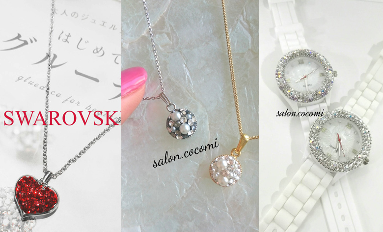 スワロフスキーで作る"グルーデコ"、キラキラ輝くオリジナルのアクセサリーを作りましょう♪ 二種類の粘土質のグルーをアクセサリーの土台へ設置し、スワロフスキーを埋め込んで作ります。