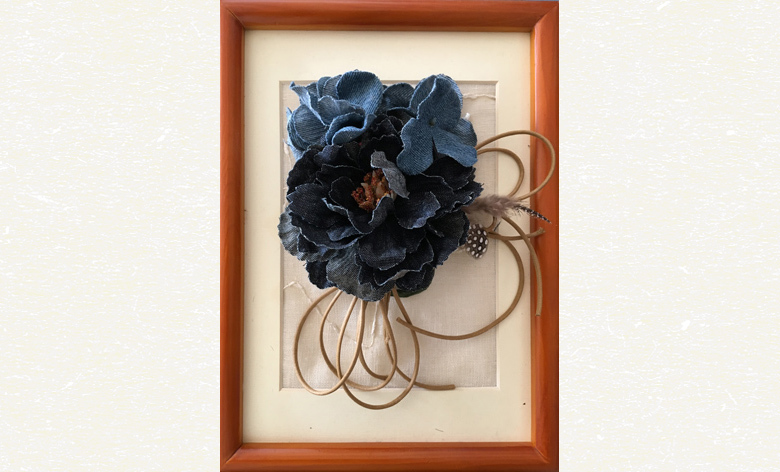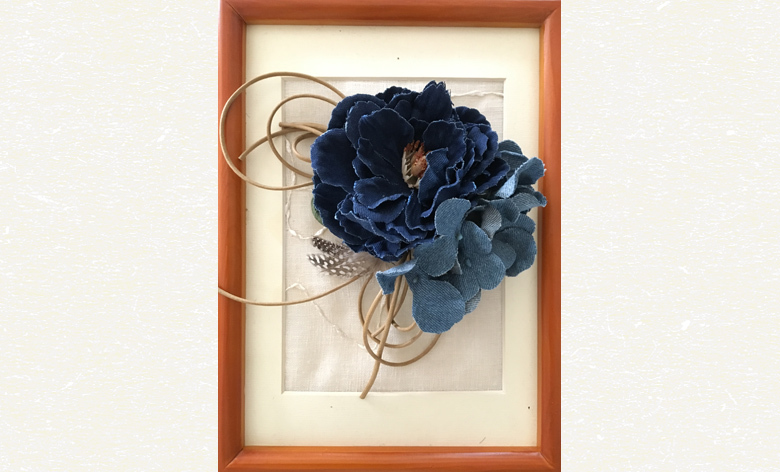 麻布・デニム生地のアーティフィシャルフラワーとプリザーブドフラワー・ホロホロ鳥のフェザー・コードリボンを使用してコサージュを作ります。お花の色はお好きな色を選んでいただきます。