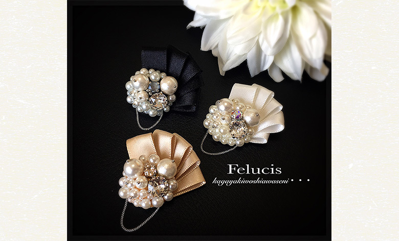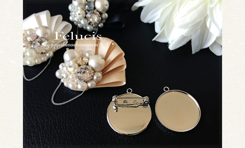 サテンリボンでエレガントさを出し、大粒のスワロフスキー®ストーンやパールを盛ります(パールはスワロフスキー®とアクリルパールを使用)。土台はシルバーで、スワロフスキー®ストーンは色を選べます。カンにつなぎ、ネックレスやストラップにするのも素敵ですね。