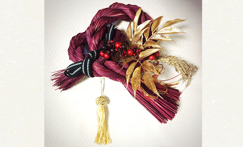 カラーしめ縄をベースに、デザイン・材料を選んでオリジナルのお飾りを作りましょう。今年も真田紐(サカモトオリモノ)を使って粋な仕上がりに!