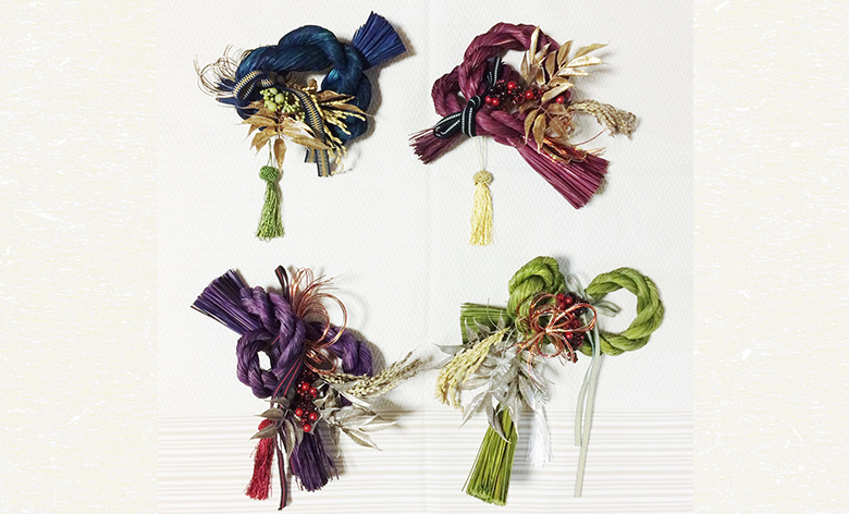 カラーしめ縄をベースに、デザイン・材料を選んでオリジナルのお飾りを作りましょう。今年も真田紐(サカモトオリモノ)を使って粋な仕上がりに!