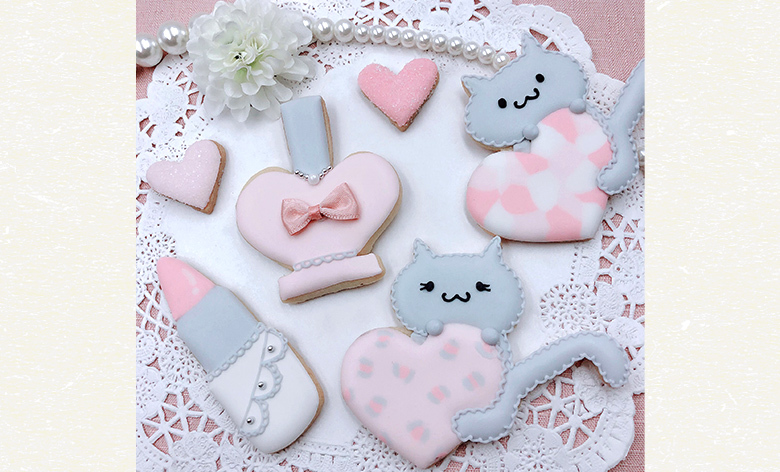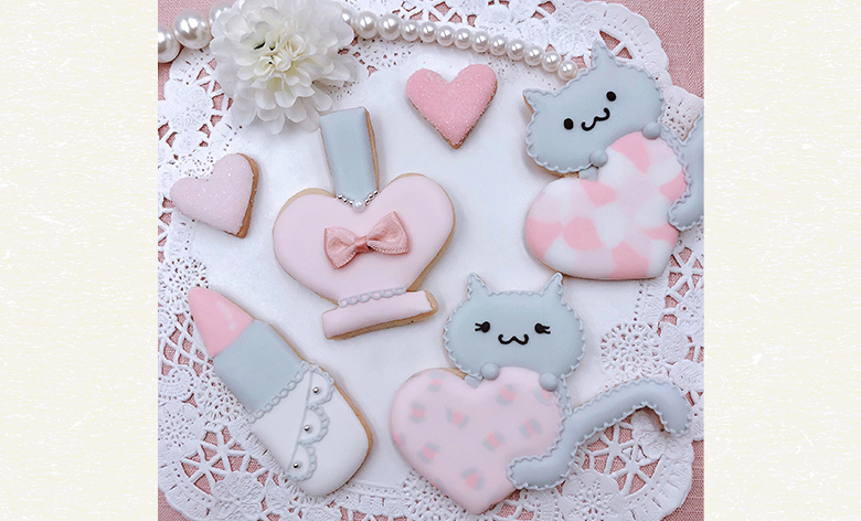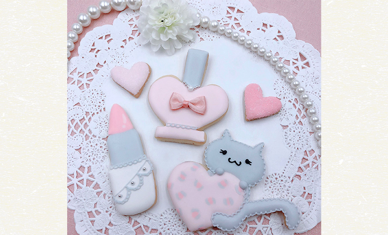 ねこ、香水瓶、リップ、ちびハートの4枚のクッキーを作りましょう。