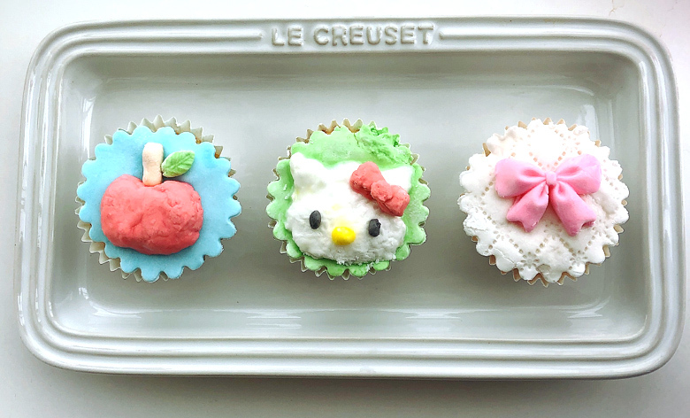 キティー、リボン、リンゴの3個のカップケーキをマシュマロを使ったマシュフォンで作成しましょう♡