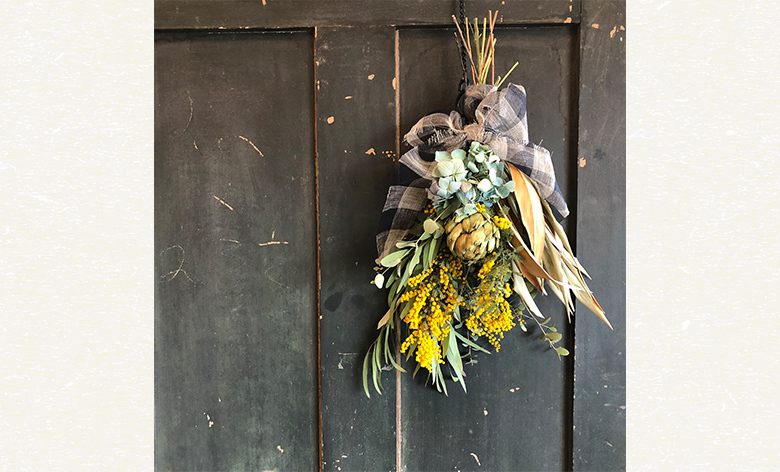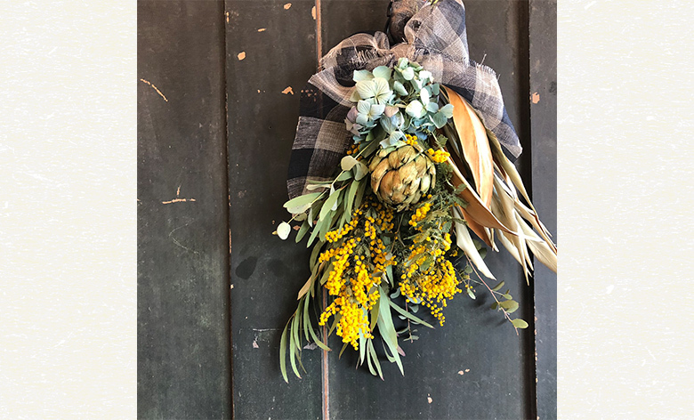 ミモザやアーティチョーク、春の息吹を感じる植物を使ってドライフラワーのスワッグを作りましょう♪