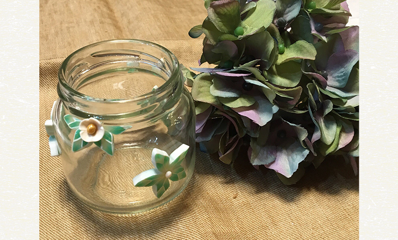 ポリマークレイ(オーブンで固まる粘土を使用)ガラスの瓶をデコして、オリジナルの花びん・小物入れを作りましょう♪