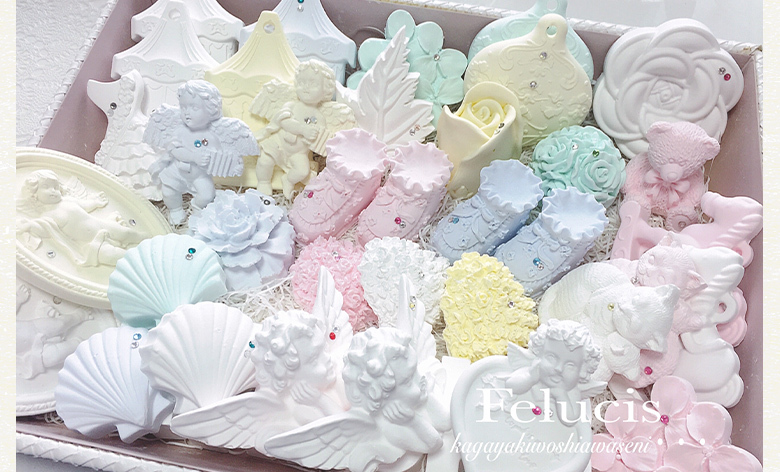 水で溶いた石膏にエッセンシャルオイルを混ぜ込み、型に流していきます。 ガラスポットに造花を飾るタイプと、かわいい型ができるタイプの2種類をご用意しています。どちらも最後にスワロフスキー®ストーンをおまけ付けした、香りの芳香剤です。