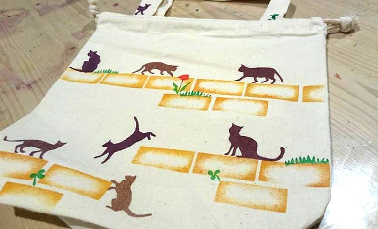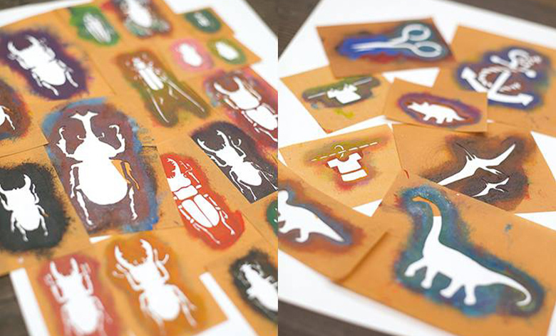 染織工房オリジナル型紙(300種類以上)を使い、自由に配置、好きな色で模様を絵付けしていき、オリジナル作品を作りましょう。