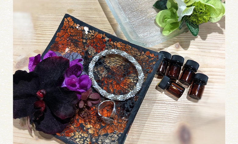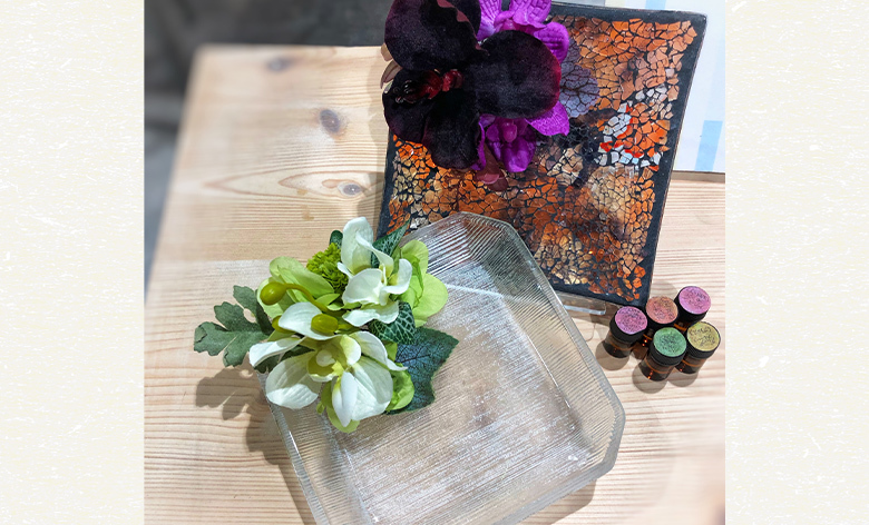 プレートにアーティフィシャルフラワーをあしらい、エッセンシャルオイル(アロマオイル)で香りを楽しみましょう。ディヒューザーとして飾ることも、アクセサリーやキーなどちょっとした小物入れにも♪