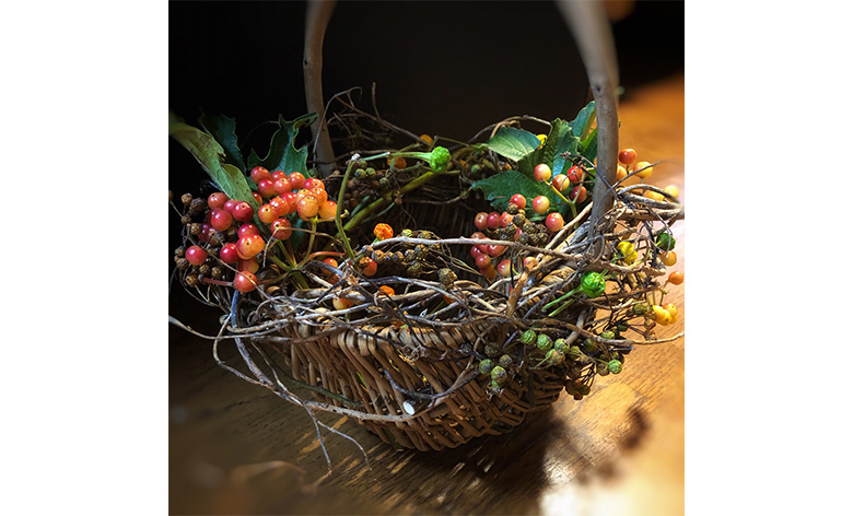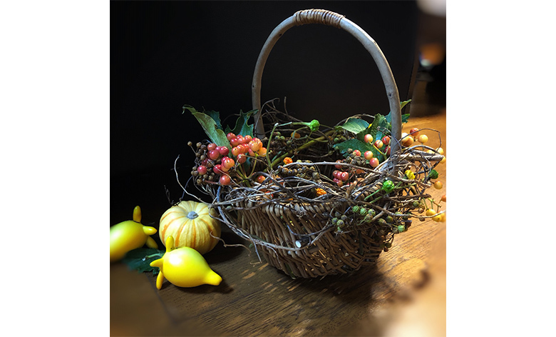 シンプルなカゴをベースに枝もの、つるもの、実ものを使ってカゴごとアレンジ! カゴとして使えるのはもちろん、そのまま飾っても!