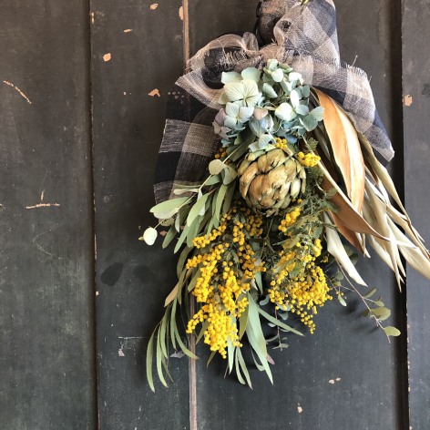 ミモザをアクセントに使った、人気のスワッグを作ります。