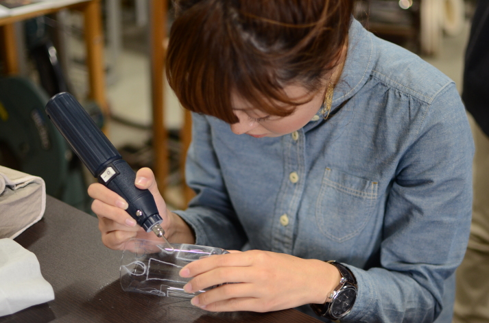 グラスやはんこにデザインを描いて、リューターという道具で削っていただくと、
