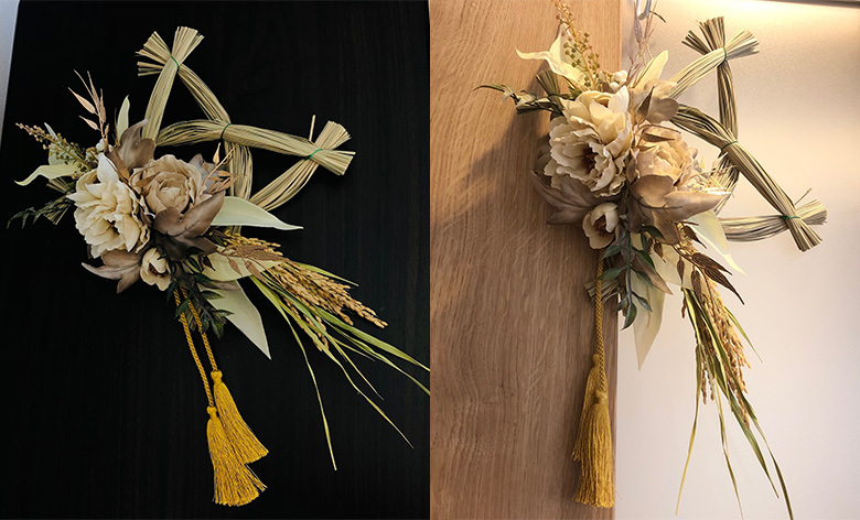 今年は新作のベースを使って、今から飾れてお正月飾りとしても、もちろん使っていただけるリース(お飾り)を作りましょう! 併せて使うアーティフィシャルフラワーやタッセルや水引も新作や新色を準備しています。色合わせやデザインなど、楽しんで作りましょう!