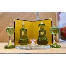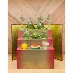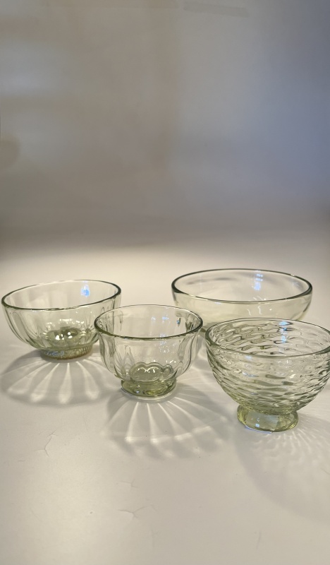 「ローハ」の穏やかなライムグリーンと、高台に巻きつけてある銀箔の少し金色味を帯びた色合いが上な「ローハシリーズ」、ガラスの厚みを微妙に変化させ、波打つようなゆがみが特徴の「ポヨポヨグラス」、季節に合わせたかわいらしいオブジェ。