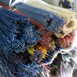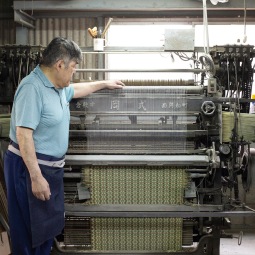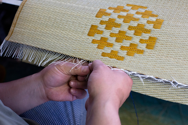 倉敷市西阿知町で開発された「岡式織機」という機械を使った技法を昭和8年から今なお引き継いでおり、さらりとした触り心地やほんのり感じるい草の香りに心安らぎます。