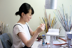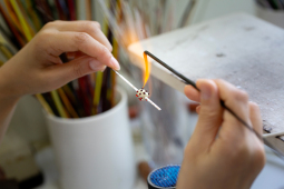 普段目にするもの、植物や生き物などの形や色を思いながら、ガラスを溶かしてひと粒ひと粒ビーズを作り、それを繋いでジュエリーを制作するオカさん。