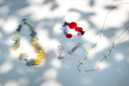 色・形・模様の違うビーズをインスピレーションで組み合わせた作品は、かわいらしさ、美しさの中に遊び心があり、個性的でポップ。シックなのに華やかな、主役になるアクセサリーです。